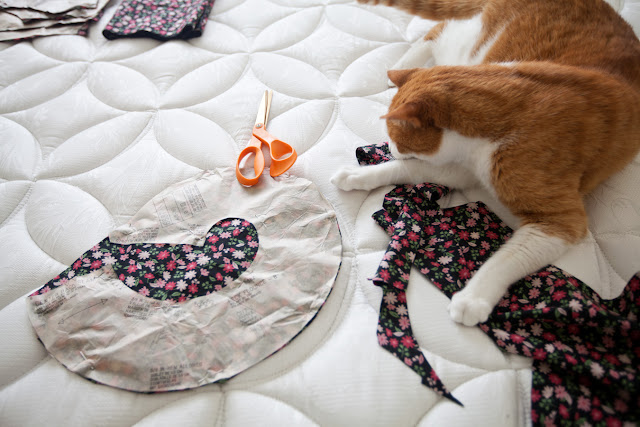 Cut out your patterns. And transfer any marks from the pattern onto your fabric. Also be sure to pin and cut out any interfacing that is needed for the dress. Here you can see fabric cat terrorizing my fabric and patterns...